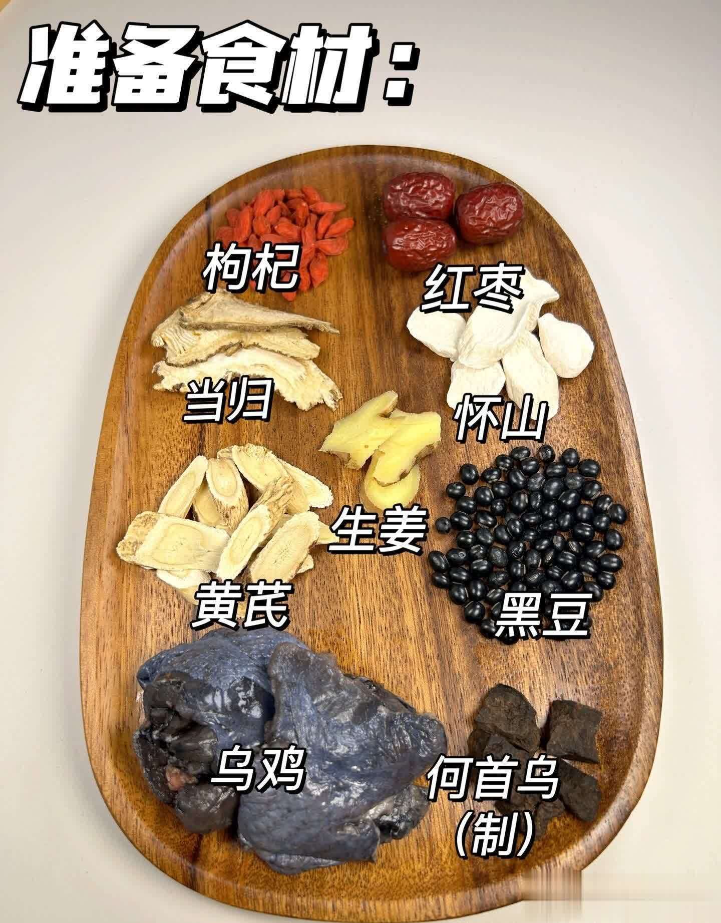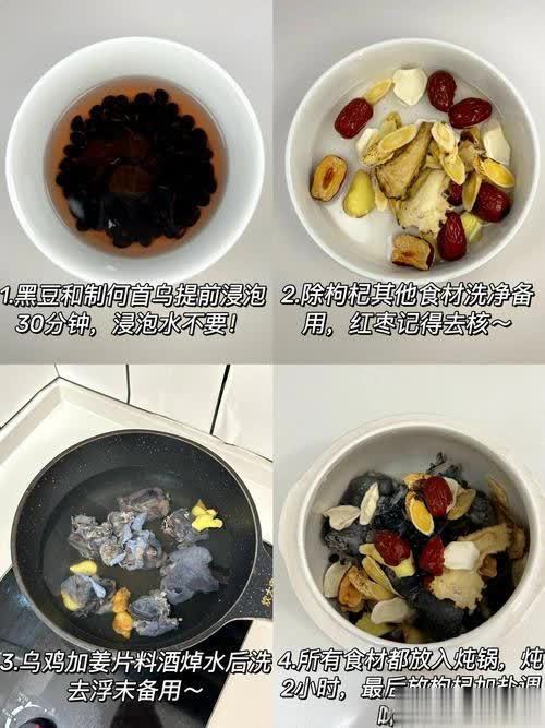 乌鸡富含优质蛋白和多种矿物质,脂肪含量低,容易消化吸收,能快速为身体补充能量;何首乌益肾固精、乌黑须发,对男性肾脏健康友好;当归补气养血,改善因熬夜、劳累导致的气血不足;黑豆含有丰富的植物蛋白和锌元素,锌能提升免疫力、改善精力。