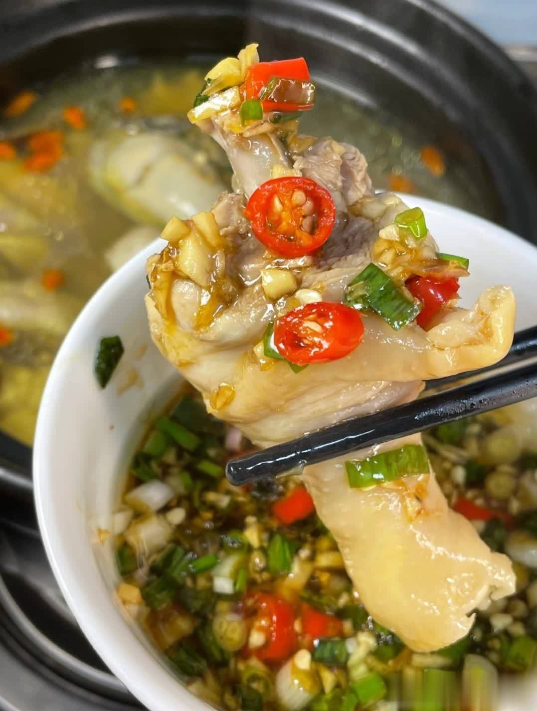 2. 砂锅中加入足量清水,放入鸡块、3片生姜和葱段,大火烧开后转小火慢炖1小时,至鸡肉软烂。