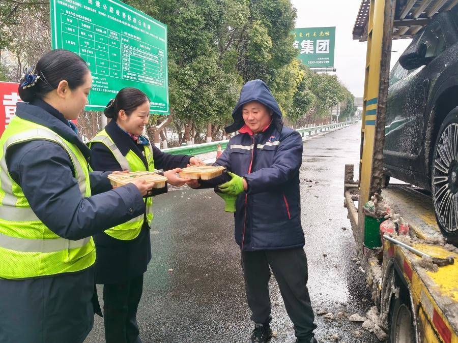 1月20日,芜湖中心芜湖收费站为因冰雪滞留的司乘人员送上热腾腾的饭菜。