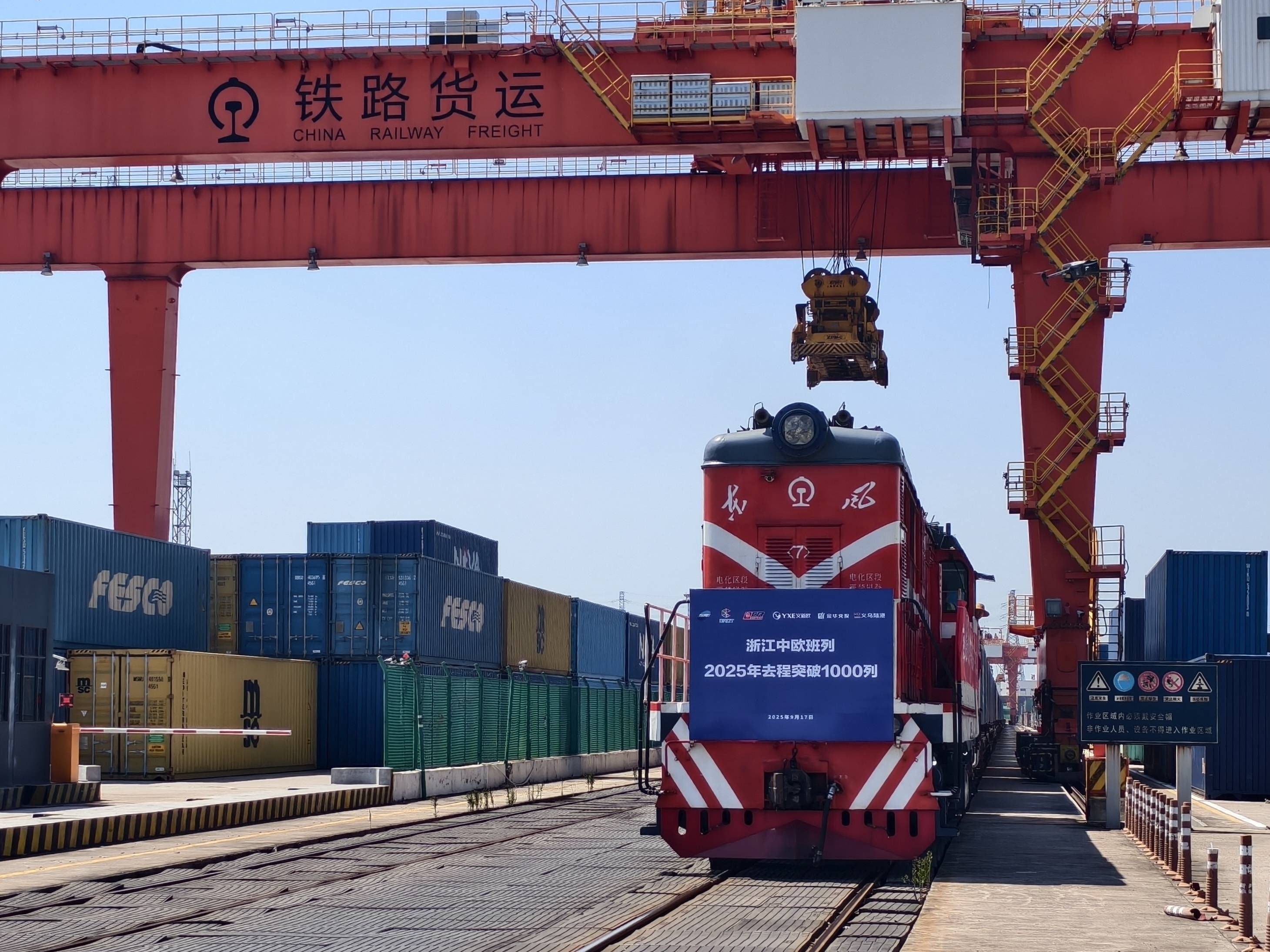 图为2025年浙江第1000列中欧班列在义乌西铁路货场等待发车。(杭州铁路物流中心供图)“中欧班列不仅构建起畅通快捷、海陆互联的‘大动脉’,而且近年来,我们明显感受到中欧班列运输模式和货物品类更多元。”班列运营方义乌市天盟实业投资有限公司运营管理总监鲍笑说,经浙江中欧班列运送的货物已由最初较为单一的日用小商品,增加到26个大类近5万个货种。