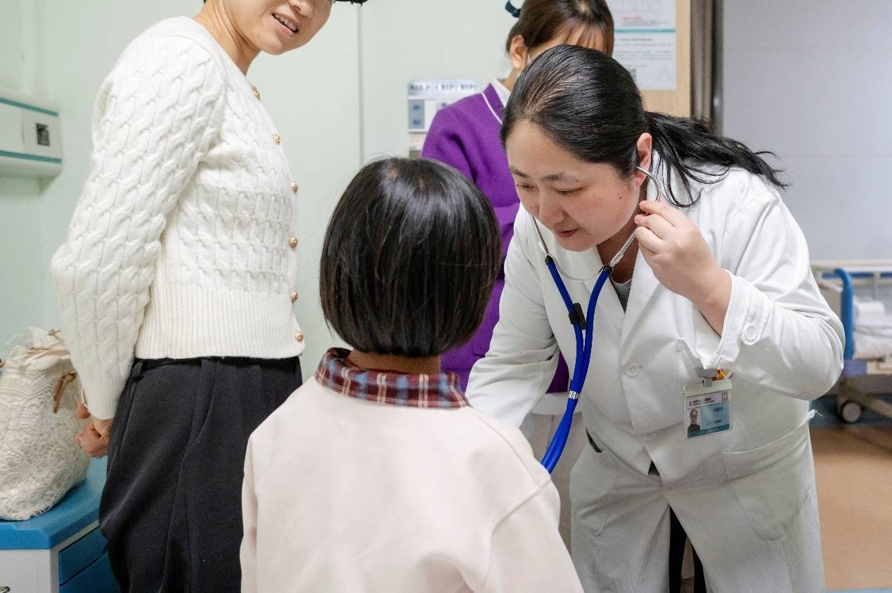 山东省第二人民医院心脏大血管外科中心主治医师张欣怡为患儿检查身体